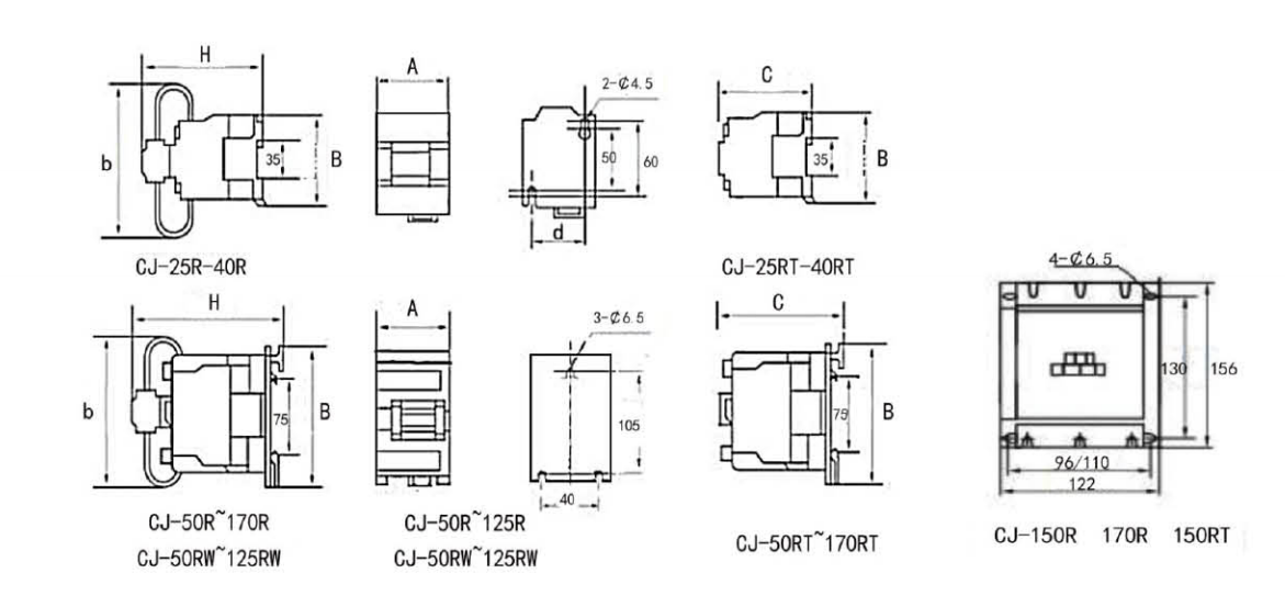 ·CJ-18R~CJ-40R提供兩對輔觸頭,可選1開1閉代號11型 或2開代號20型,默認11型。 ·CJ-50R~CJ-125R提供三對輔觸頭,全部為2開1閉代號21型(可省略)。 ·CJ-150R 170R提供一對常開輔助觸頭。? ·RT型產品沒有限流機構和限流阻抗,必須工作在串接電抗器的回路中。 ·25kvar~60kvar 可選配外引接線式,下單清注明。 |